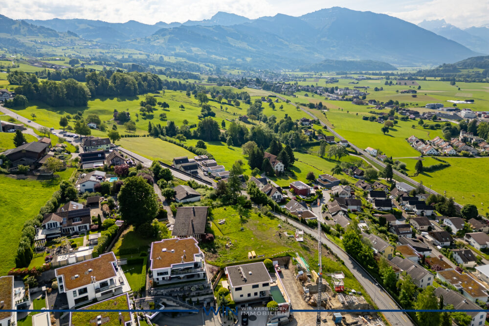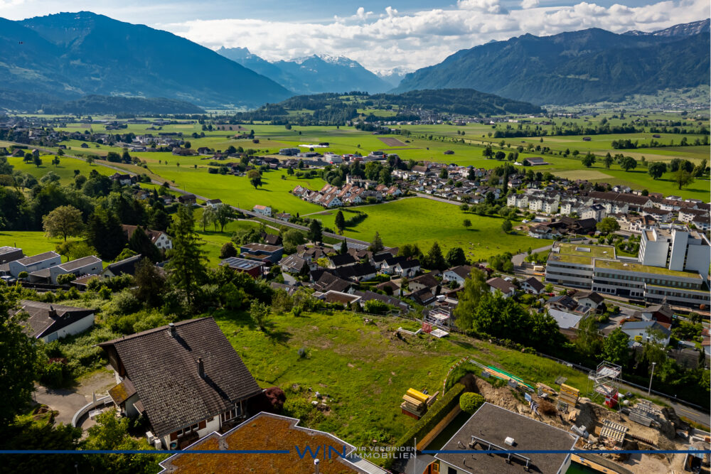 The fully developed building plot no. 1588 (Rüti) is situated in an elevated, privileged and very sunny location in the immediate vicinity of the village centre, where access is guaranteed via the "Frohe Aussicht", a quiet side street with no through traffic. The property is fully south-facing, which provides excellent sunlight and a wonderful, unobstructed panoramic view of the Linth plain and across Lake Zurich.