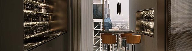 The open-plan living area impresses with floor-to-ceiling windows that offer a breathtaking panoramic view of the Dubai skyline and the sea. Here you will also find access to a spacious balcony where you can enjoy relaxing evenings overlooking the marina.