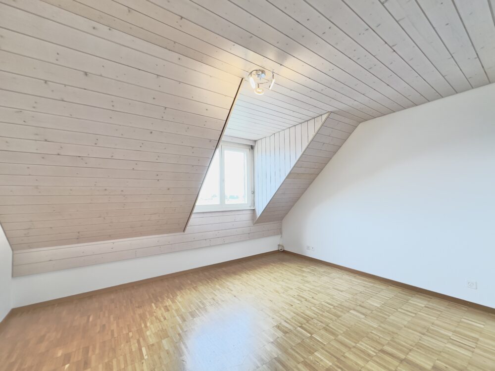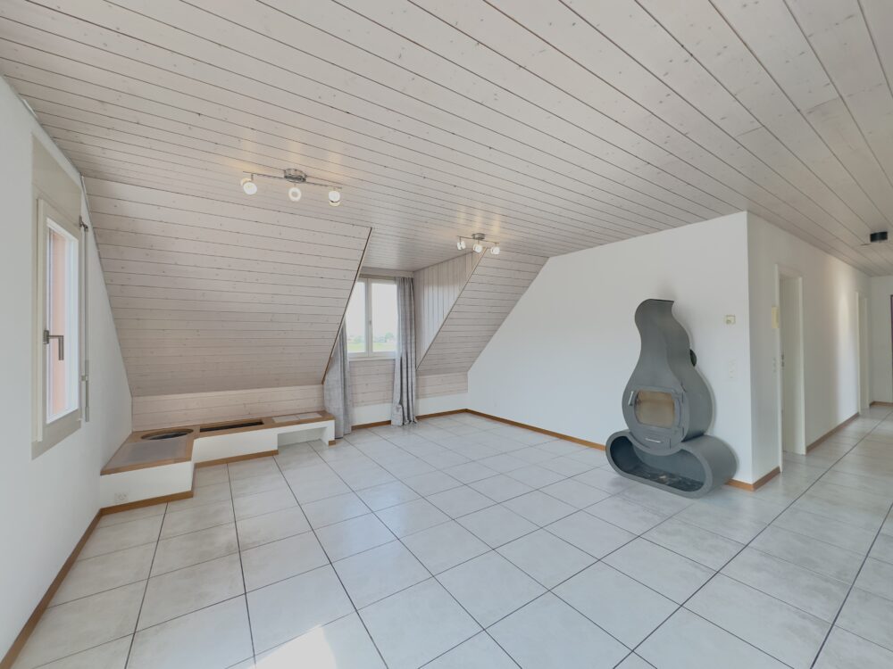 Wer dieses Zuhause betritt, spürt sofort: Hier oben beginnt eine andere Art zu wohnen. Diese Dachwohnung vermittelt Leichtigkeit, Offenheit und Ruhe – verbunden mit einem Grundriss, der sich dem Leben anpasst, nicht umgekehrt. Ob Rückzug, Begegnung oder Alltag: Alles findet hier seinen Platz – harmonisch eingebettet in eine charmante Wohn-Atmosphäre über den Dächern. Schon beim Ankommen entfaltet sich ein Gefühl von wohliger Geborgenheit. Der Wohn- und Essbereich beeindruckt mit grosszügiger Raumwirkung, natürlichen Materialien und einem feinen Spiel aus Licht und Struktur. Die sichtbare Dachform, gepflegte Holzelemente und grosse Fensterflächen verleihen dem Raum Charakter – und lassen ihn zugleich leicht und einladend wirken, wie ein eigenes Refugium über den Dächern. Der Blick nach draussen öffnet sich weit – über den sonnigen Balkon hinaus bis in die Ferne. Ein Ort, der Stille und Erholung schenkt. Ein Platz zum Atmen, Ankommen und Sein. Ein Zuhause, das nichts beweisen muss – und genau darin seine stille Stärke entfaltet.