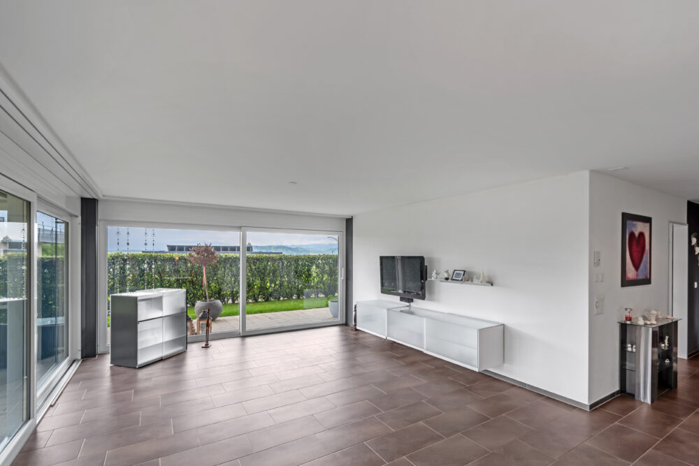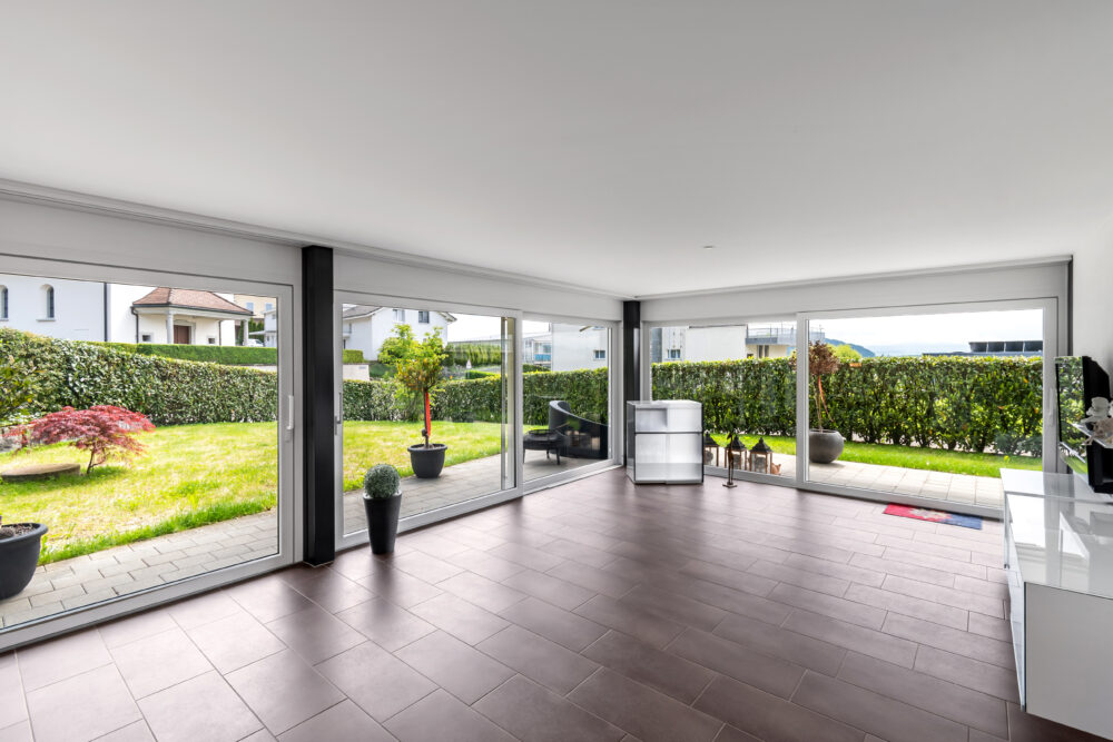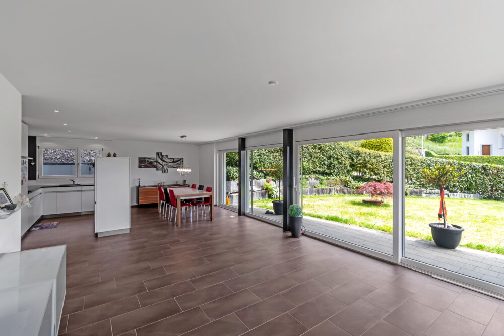 Ein grosser Living Bereich mit einem Rund-um-Blick in den Garten. Der komplette Living wird vom Garten umarmt. Einfach eine Lounge-Landschaft entstehen lassen oder einen Kräutergarten oder einfach beides, denn hier haben Sie die Möglichkeit sich zu entfalten ob im Haus sowie im Garten. Dank den grossen Fensterfronten zum Garten könne Sie jede Facette jederzeit geniessen.