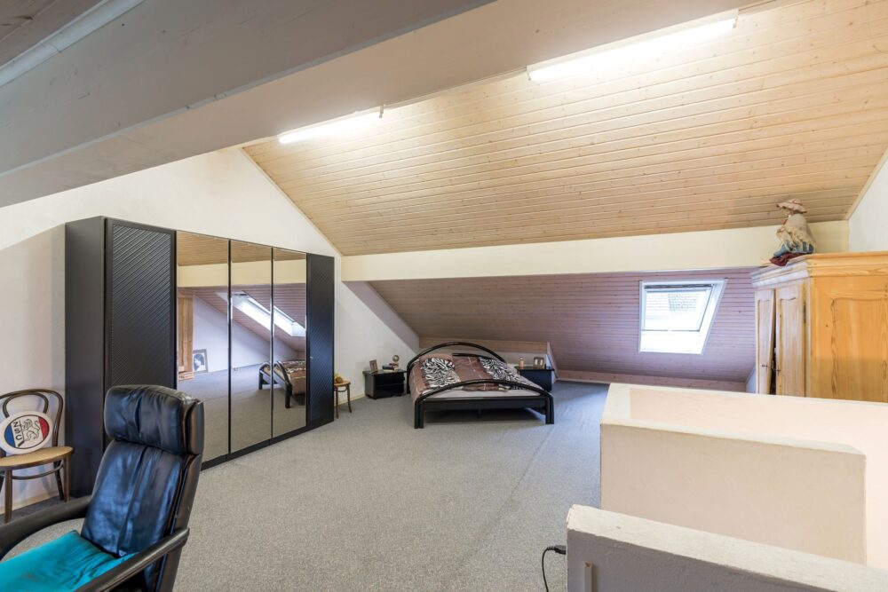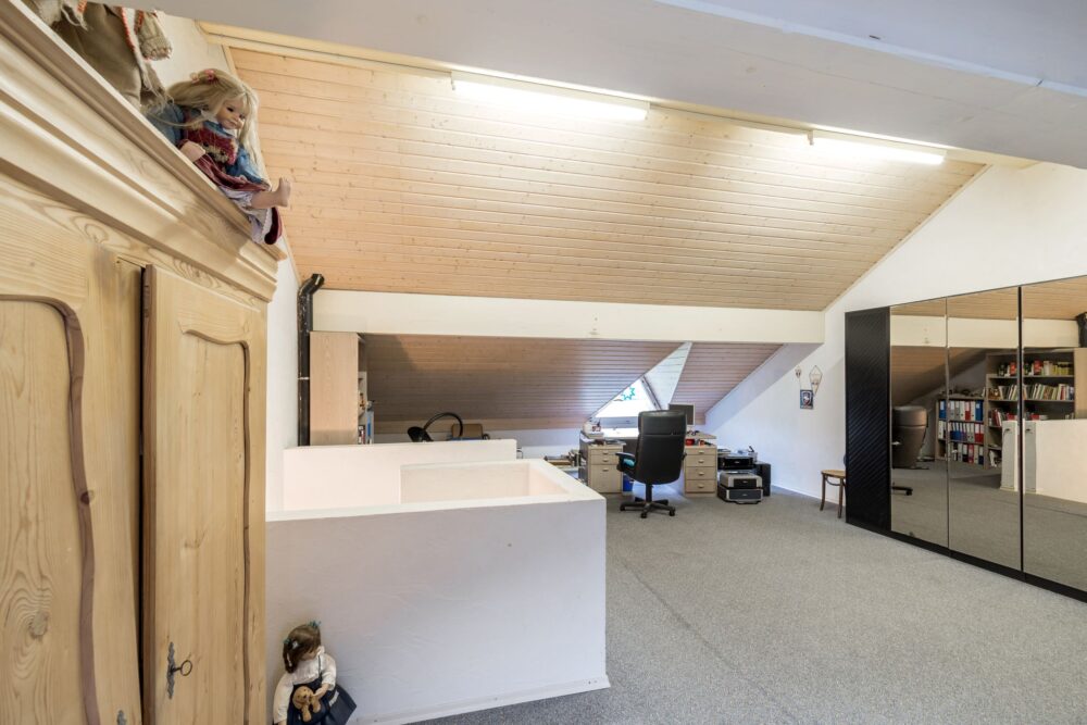 Die Krone setzt dem Ganzen schlussendlich das luftige und weitläufige Zimmer im beheizten Dachgeschoss mit über 60m2. Dieser gut durchdachte Raum bietet viele Möglichkeiten, um ein zweites Wohnzimmer, ein Büro oder Ihre private Wellnesoase (Wasseranschluss vorhanden) zu kreieren.Als wäre dies nicht genug, befindet sich nebst dem weitläufigen, Keller im Untergeschoss, ein gepflegter Bastel- Hobbyraum, die Waschküche mit Waschmaschine / Tumbler und ein Abstellraum. Hier haben Sie genügend Platz, um Ihr eigenes Fitnessstudio oder einen Partyraum für Ihre Kinder zu gestalten – Ihren Ideen sind keine Grenzen gesetzt. Von hier aus gelangen Sie direkt zu Ihren zwei Tiefgaragen-Parkplätze, welche natürlich im Preis inbegriffen sind.
