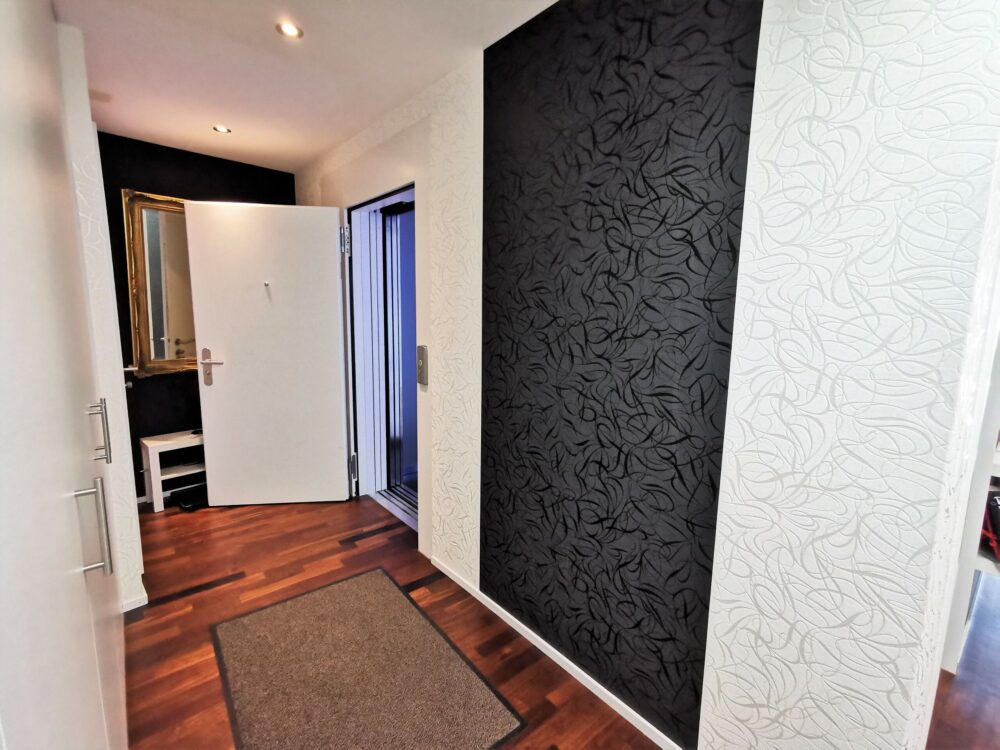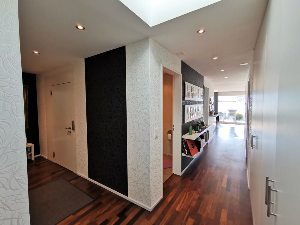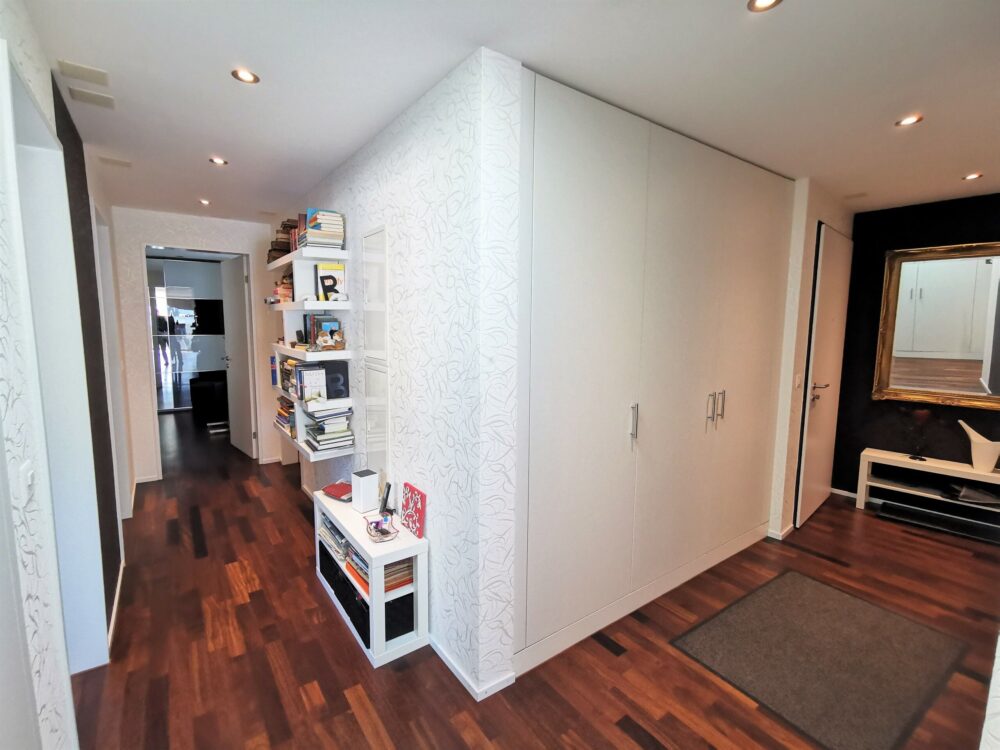 An oberster Stelle erleben Sie hier ein 5.5 Zimmer-Raumwunder auf ca. 150 m2 Wohnfläche mit einem unglaublichem Rundumblick. Via Lift gelangen Sie direkt ins Penthouse, ohne das Treppenhaus in Augenschein nehmen zu müssen. Der grosszügige Eingangsbereich trotzt nur so von praktischen Einbauschränken und viel Stauraum.