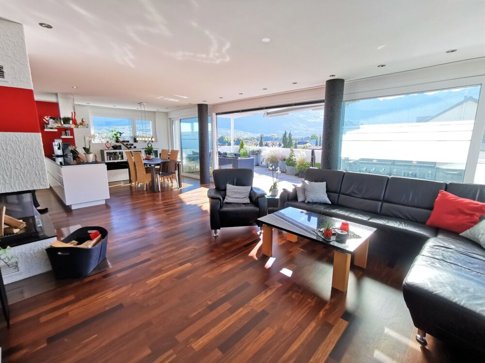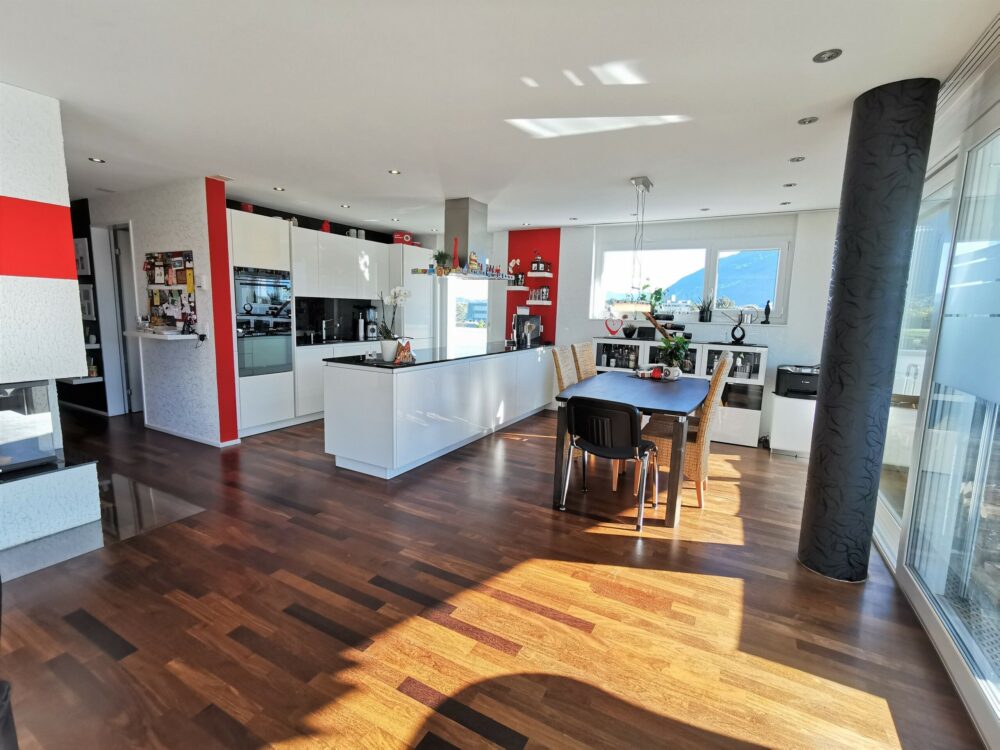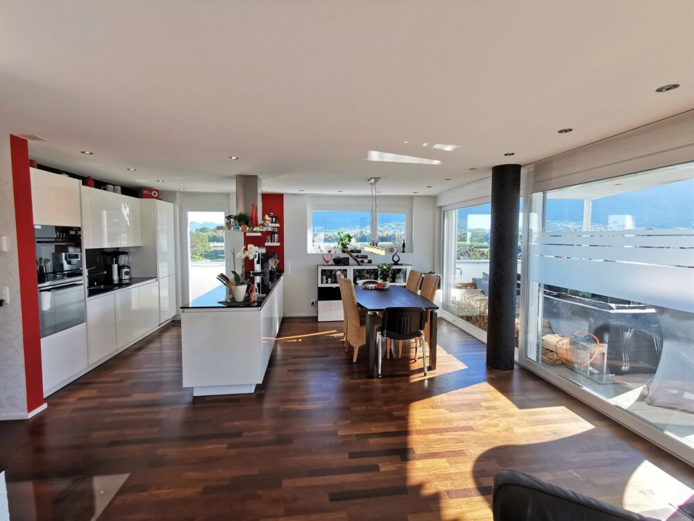 Das herrliche Wohn- und Esszimmer ist offen und regelrecht lichtdurchflutet gestaltet und bietet einen exklusiven sowie direkten Zugang zur über 113 m2 grossen Terrasse mit einem fantastischem Ausblick sowie höchster Privatsphäre. Die Küche ist nicht nur top modern ausgestattet und verfügt über sehr viel Ablagefläche, sie überzeugt neben Design, Zustand auch durch eine Vollausstattung auf höchstem Niveau. Das wärmende Cheminée sorgt für heimeliges Ambiente und gemütliche Stunden mit Ihren Liebsten in modernem Umfeld.