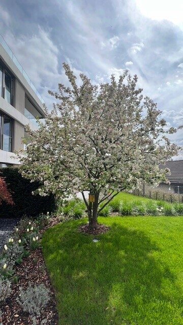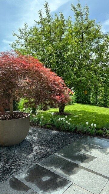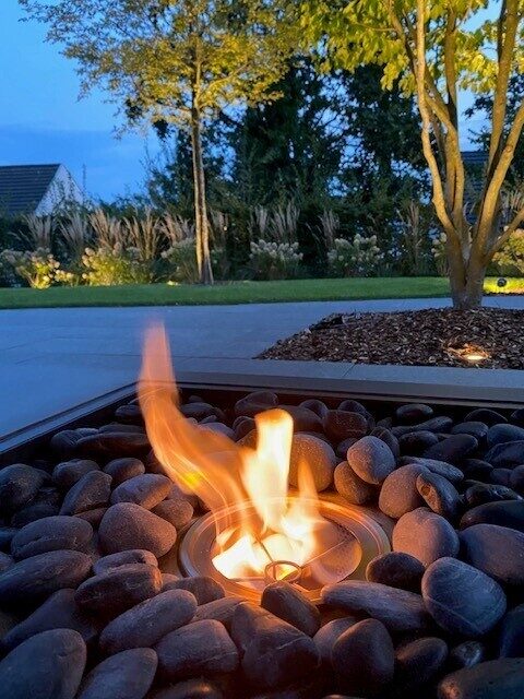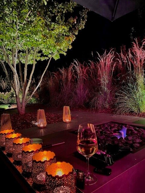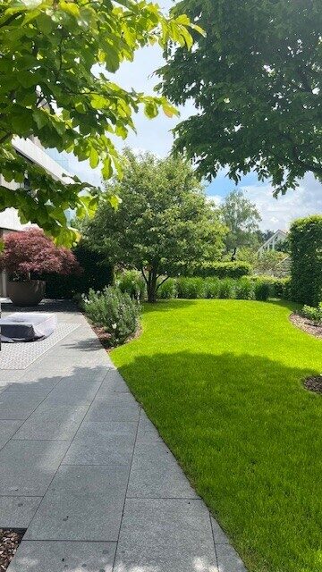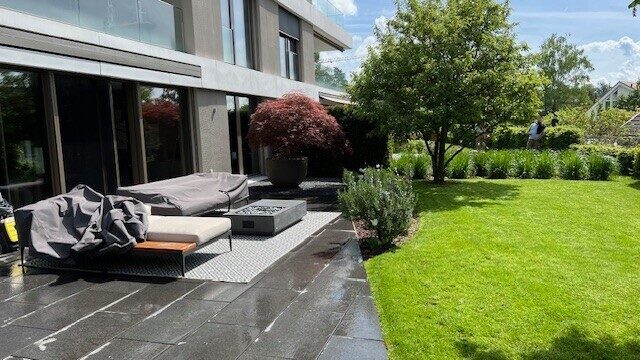 Liebevoll angelegte Grünflächen mit stimmungsvoller Außenbeleuchtung machen diesen Ort zu einer Oase der Ruhe – perfekt für entspannte Abende, Dinnerpartys oder ruhige Stunden inmitten von Natur. Der gepflegte Rasen, umrahmt von Bäumen und Sträuchern, bietet gleichzeitig Privatsphäre und Grossmütigkeit.