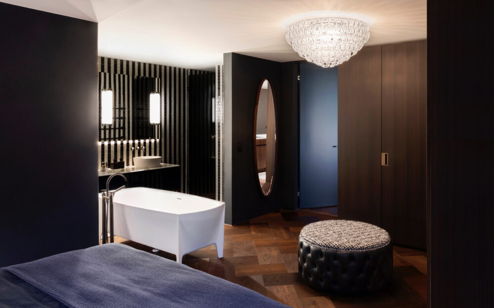 * Exklusive Designerleuchten und massgefertigte Einbaumöbel.
