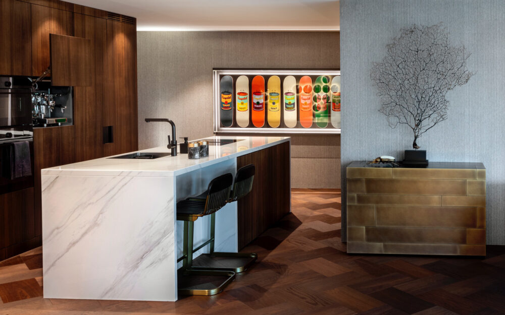 Eine grosszügige Kochinsel aus hellem Marmor mit klarer Linienführung bildet das Herzstück. Schwarze Armaturen und hochwertige Einbaugeräte fügen sich nahtlos in das elegante Gesamtbild ein. Akzentuiert wird der Raum durch Kunstwerke und originelle Lichtobjekte, die der Küche eine ganz persönliche Note verleihen.