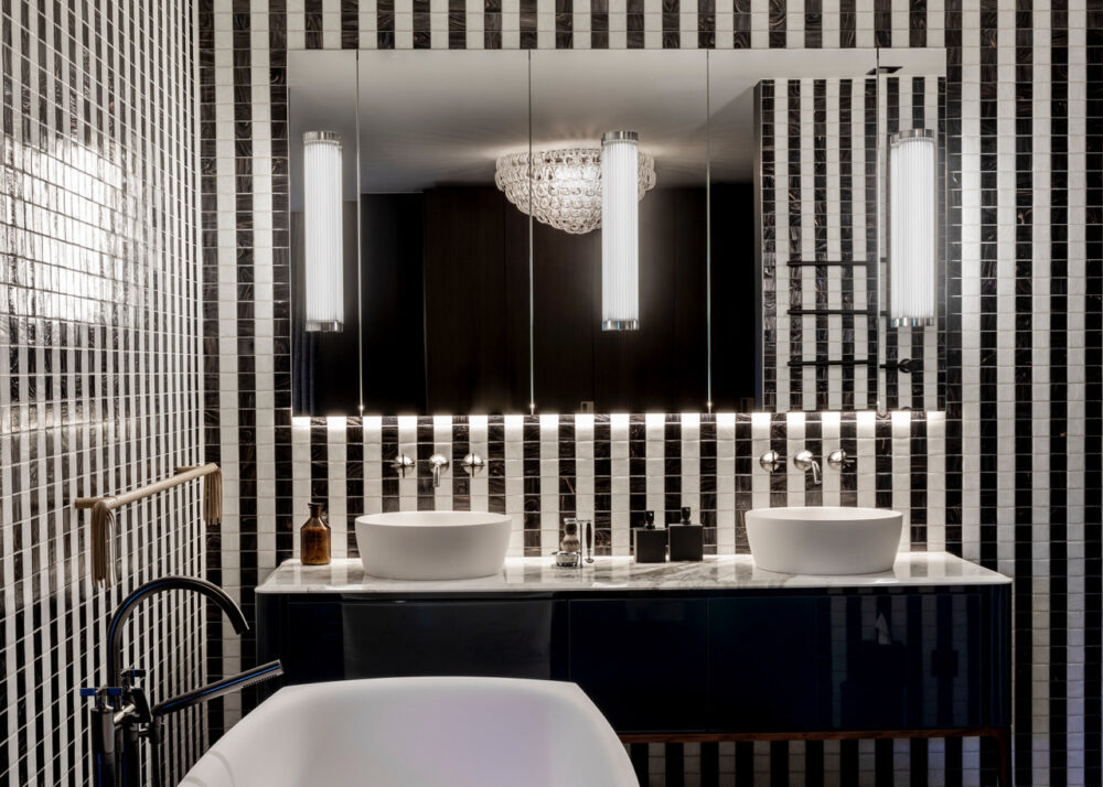 Eine frei stehende Badewanne bildet den Mittelpunkt, ergänzt von stilvollen Waschbecken, grossformatigen Spiegeln und einer detailreichen Lichtgestaltung. Die Kombination aus dunklen Holzelementen und edlem Stein schafft ein elegantes SPA-Gefühl. Ein weiteres Bad zeigt sich in modernem Design mit hellen Oberflächen, exklusiven Armaturen und fein strukturierten Fliesen.