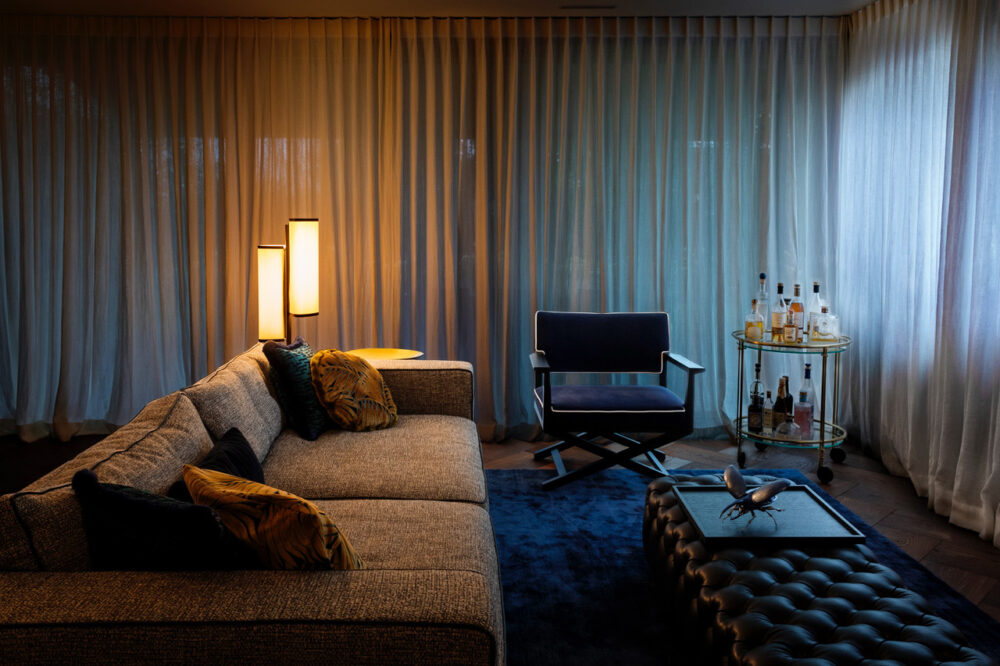 Grossflächige Fensterfronten lassen den Raum mit Tageslicht durchfluten und schaffen ein offenes, helles Ambiente. Der elegante Wohnbereich ist mit hochwertigen Materialien ausgestattet – Dunkles Eichenparkett bildet eine warme Grundlage, während edle Stoffe und moderne Möbelelemente für zeitlose Eleganz sorgen. Ein stilvoller Loungebereich bietet Platz für gemütliche Abende, ergänzt durch eine atmosphärische Lichtgestaltung, die für jede Stimmung die passende Kulisse schafft.