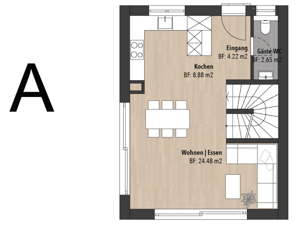 Die Grundrisse sind offen und modern konzipiert und lassen individuelle Gestaltungsmöglichkeiten zu. Die hochwertigen Einbauküchen mit Unter-/Ober- und Hochschränken laden zum Kochen ein, mit hochwertigem Naturstein und integrierter Beleuchtung sowie sehr guten Einbaugeräte. Alles wird in Massivbauweise erstellt und entspricht den modernsten Baukriterien.