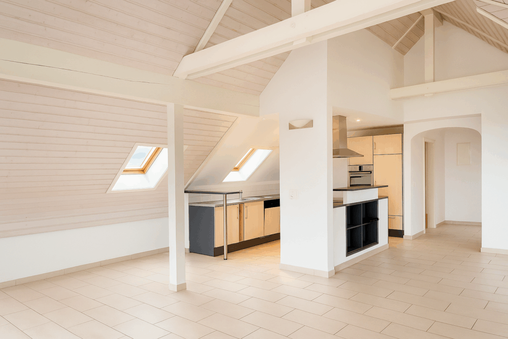 Wer grosszügige Räume, natürliche Ruhe und ein Zuhause mit Charakter sucht, wird hier fündig. Diese charmante Dachwohnung bietet ein besonderes Wohngefühl – lichtdurchflutet, offen gestaltet und geprägt von stilvollen, weissen Sicht-Holzkonstruktionen. Die offene Wohnküche mit Kochinsel bildet das Herzstück: ein einladender Treffpunkt mit viel Platz und direktem Zugang zum Balkon. Der Lift führt Sie bequem und mit Privatsphäre direkt in die oberste Etage.