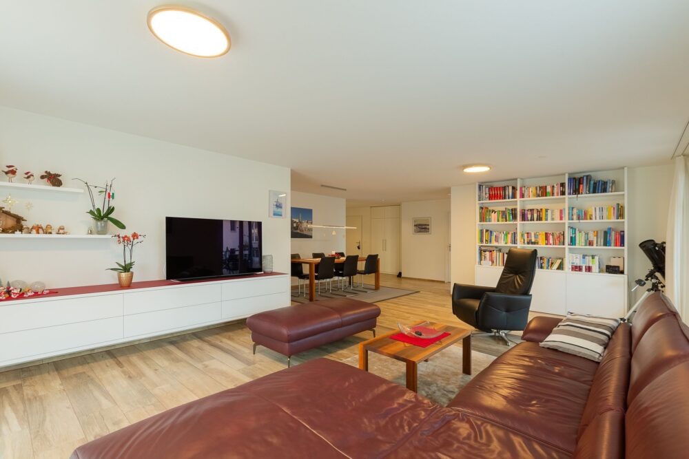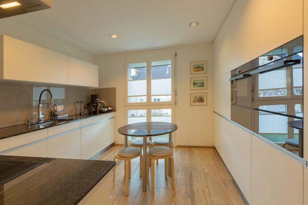 Bereits beim Betreten, werden Sie vom Grundriss überzeugt. Sehr offen, hell, weitsichtig einfach mit dem gewissen Etwas. Bereits beim Eingangsbereich wurde viel Platz geschaffen, dank sehr vielen Einbauschränken, welche sich einfach perfekt integrieren, ohne es zu bemerken. Viel Stauraum, ohne den filigranen Schnitt zu verändern. Der Living Bereich mit direktem Zugang zur Terrasse ist offen und wird sich Ihren Bedürfnissen anpassen. Wenn Sie gerne die Wärme der Flammen lieben, dann kein Problem, denn gut versteckt bietet sich auch für ein Cheminée den richtigen Platz. Grosse Fensterfronten lassen das natürliche Licht hinein und die Küche (2015) wurde auf sehr hohem Niveau komplett renoviert. Hochwertige Geräte, qualitative Wahl der Fronten, ein Harmonie-Spiel zwischen Stein und Glas – eine Küche die Köche zum Schmelzen bringen wird.