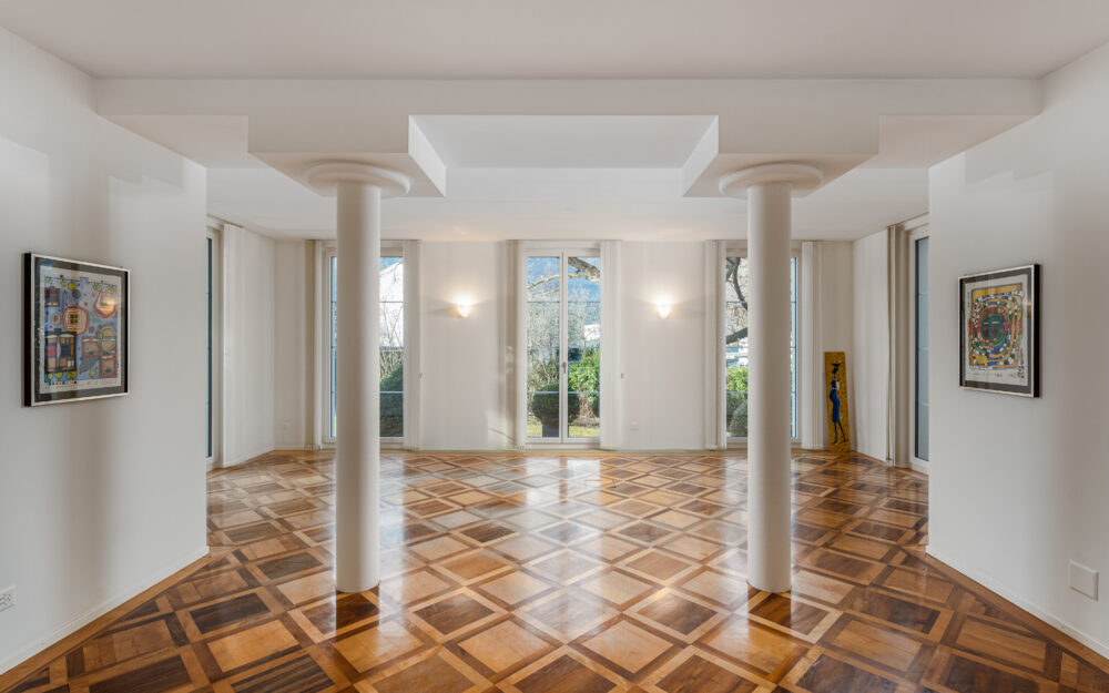 Massive Aussenwände, holzverkleidete Wandfelder an den hohen Wänden in Kassettenbauweise mit subtilen Zierfräsungen sowie hochwertige Parkettböden lassen jeden Raum seinen eigenen Charakter ausleben, in harmonischer Folge, grosszügig und dennoch klar zoniert. Die ornamentalen Stuckeinlagen an den Decken, grosszügigen Fensterfronten und die massiven, hohen Eichen-Türen in unvergleichlicher Eleganz sind nur ein kleiner Teil dieser Imposanz, die subtil Stil und Raffinesse vermittelt und ein Gefühl zeitloser Würde sowie historischer Tiefe erzeugt. Eine einzigartige Villa, die vielfach kopiert wurde, deren unverwechselbare Authentizität jedoch für immer dem Original vorbehalten bleibt.