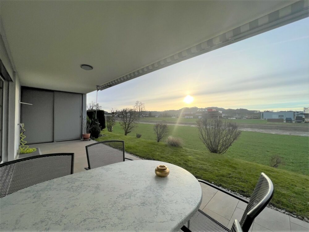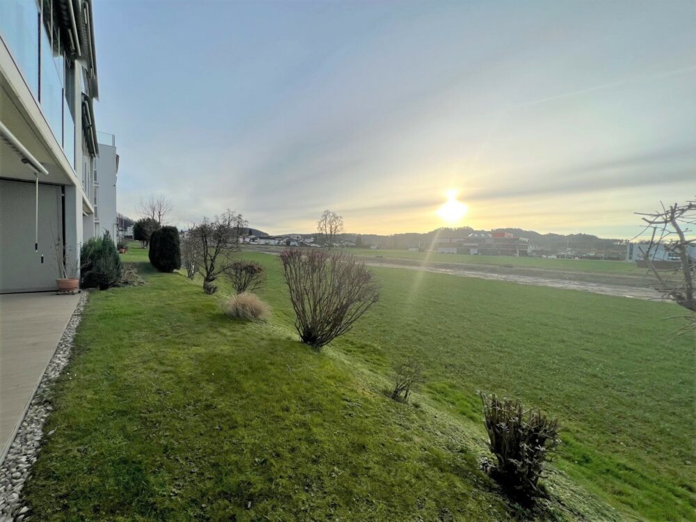 Ein moderner Wohntraum, herrlich den Abend ausklingen zu lassen wenn die Sonnenstrahlen den Living-Bereich in warmen Farben erstrahlen lassen.